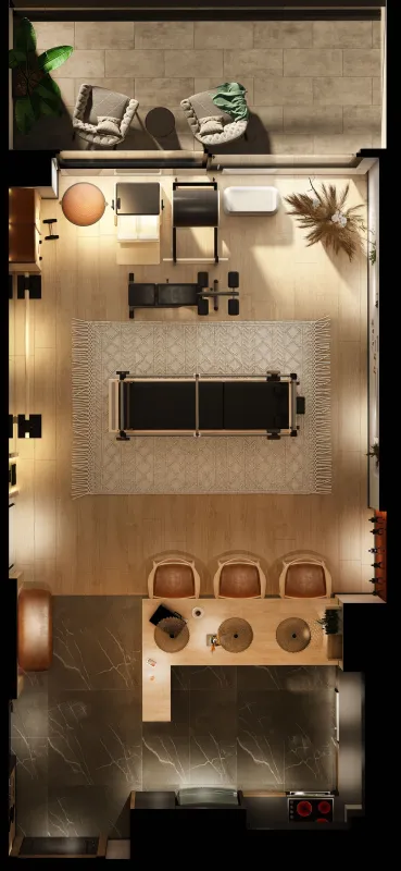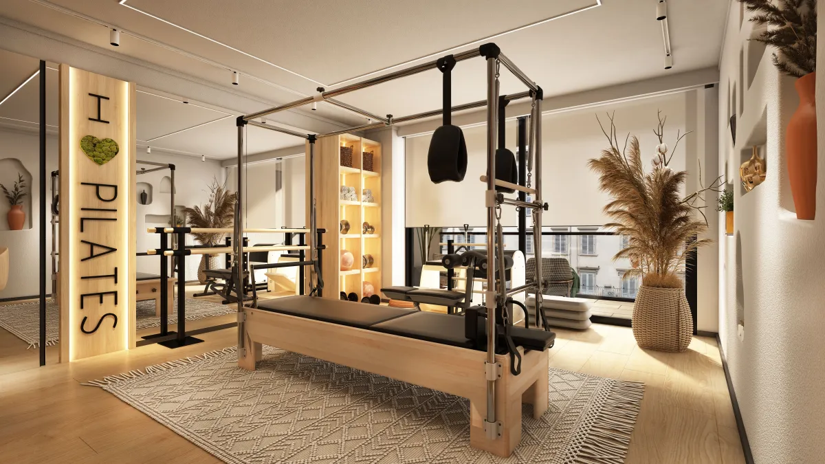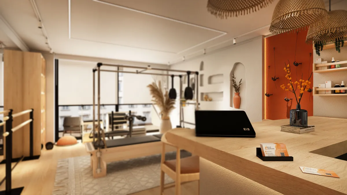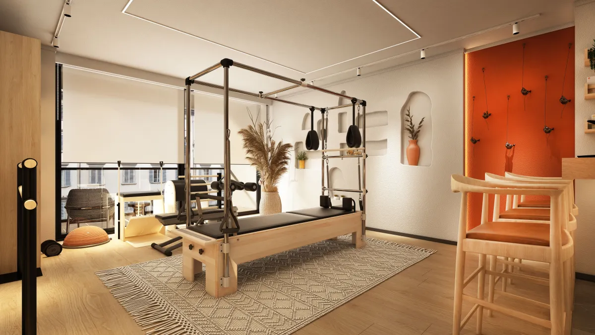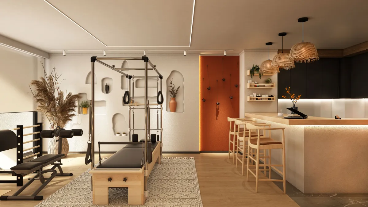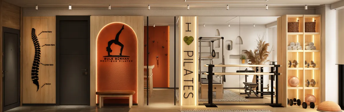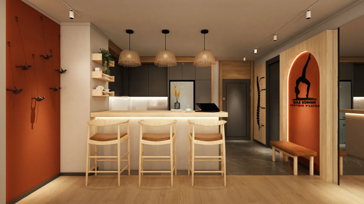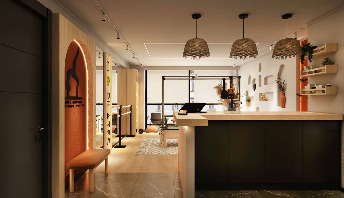 Bu pilates salonu, işlevselliği ve estetiği bir araya getiren modern bir yaklaşımla tasarlandı. Mekanın genelinde hakim olan dingin atmosfer, yoga ve pilates gibi zihin ve beden bütünlüğünü hedefleyen aktiviteler için ideal bir zemin oluşturuyor. Resepsiyon ve bekleme alanı, müşterilere yardımcı olmak aynı zamanda dinlenmek ve diğer üyelerle sosyalleşmek için de kullanışlı bir köşe sunuyor. Asıl egzersizlerin yapıldığı ana salon, geniş ve ferah bir yapıya sahip. Yüksek tavanlar ve büyük pencereler, doğal ışığın içeri girmesini sağlayarak mekanı aydınlık ve davetkar hale getiriyor. Ekipman odası, ekipmanların düzenli bir şekilde saklandığı bu oda, salonun düzenini korumaya yardımcı oluyor. Ahşap ve doğal taş görünümlü seramik gibi malzemeler, mekana sıcak ve samimi bir hava katıyor. Bu malzemeler, aynı zamanda doğallığı ve sürdürülebilirliği temsil ediyor. Beyaz, gri ve bej gibi nötr renkler, mekanın genelinde hakim. Bu renkler, sakinleştirici bir etki yaratırken, aynı zamanda diğer renklerle kolayca kombin edilebiliyor. Yer yer kullanılan canlı renk detayları, mekana enerji katıyor. Bu detaylar, genellikle minderler, yoga matları veya duvar süslemeleri şeklinde kendini gösteriyor. Büyük pencereler ve cam tavanlar, doğal ışığın içeri girmesini sağlayarak mekanın aydınlık ve ferah olmasına yardımcı oluyor. Salon, sadece egzersiz yapmak için değil, aynı zamanda ruhsal ve fiziksel olarak yenilenmek için de ideal bir ortam sunuyor. Mekanın atmosferi, müşterilerin kendilerini özel hissetmelerini sağlamak için özel olarak kurgulandı.